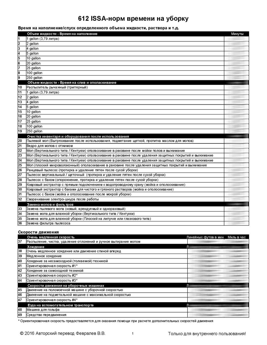 612 ISSA-нормы времени на уборкуСправочник нормативов времени на выполнение клининговых работ от Всемирной клининговой ассоциации ISSA, 2016 года издания, включающий порядка 600 видов работ. (12 страниц) Русскоязычная версия. |