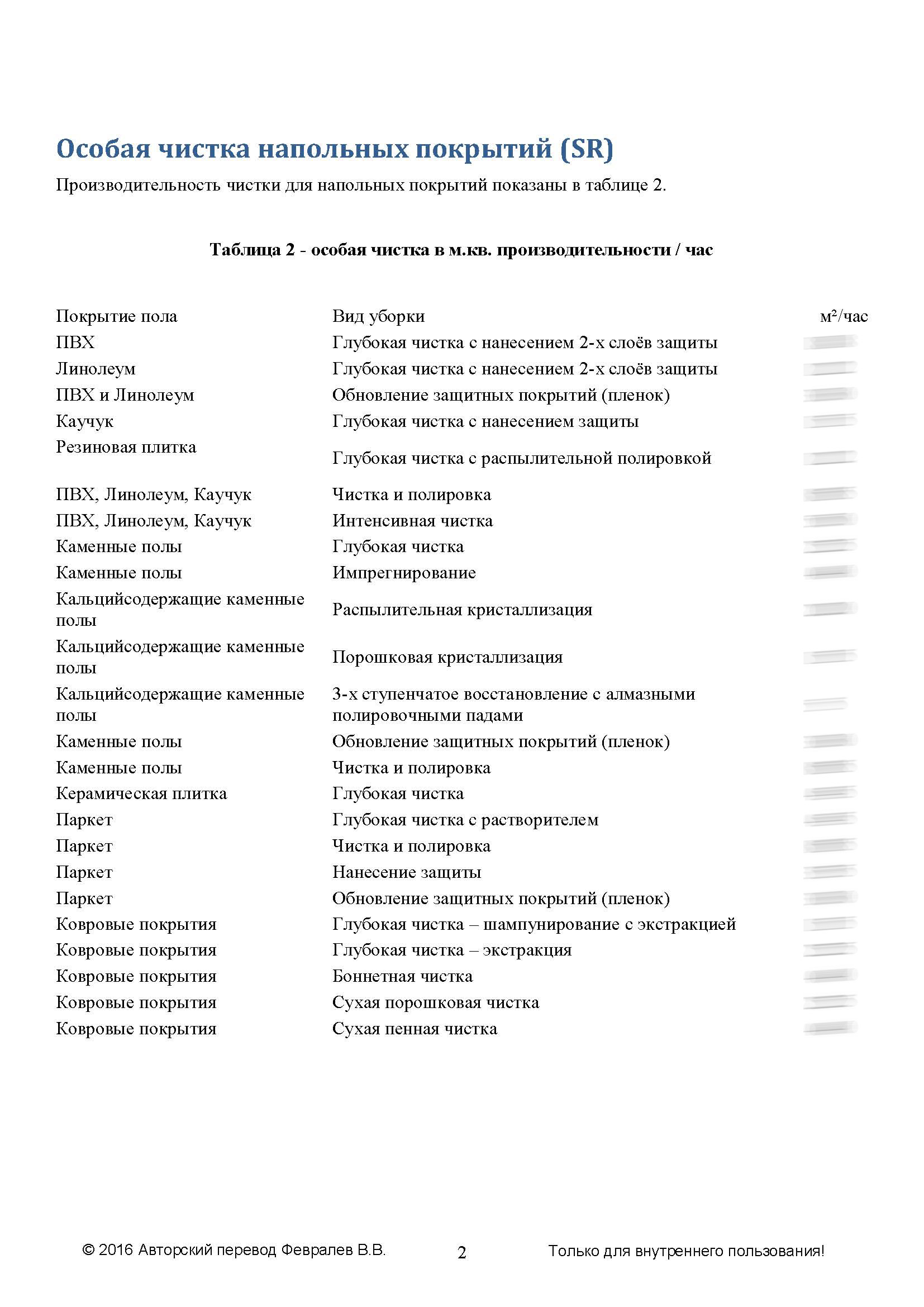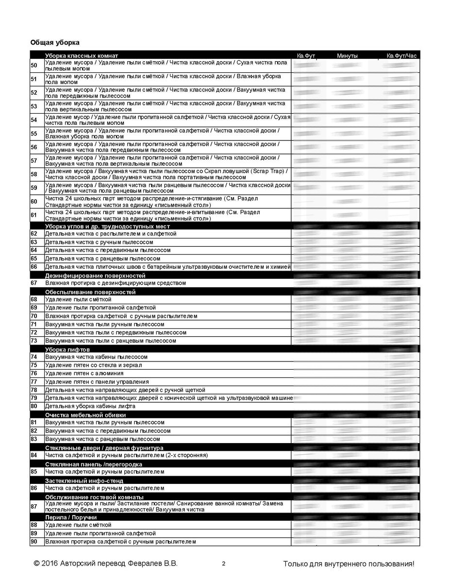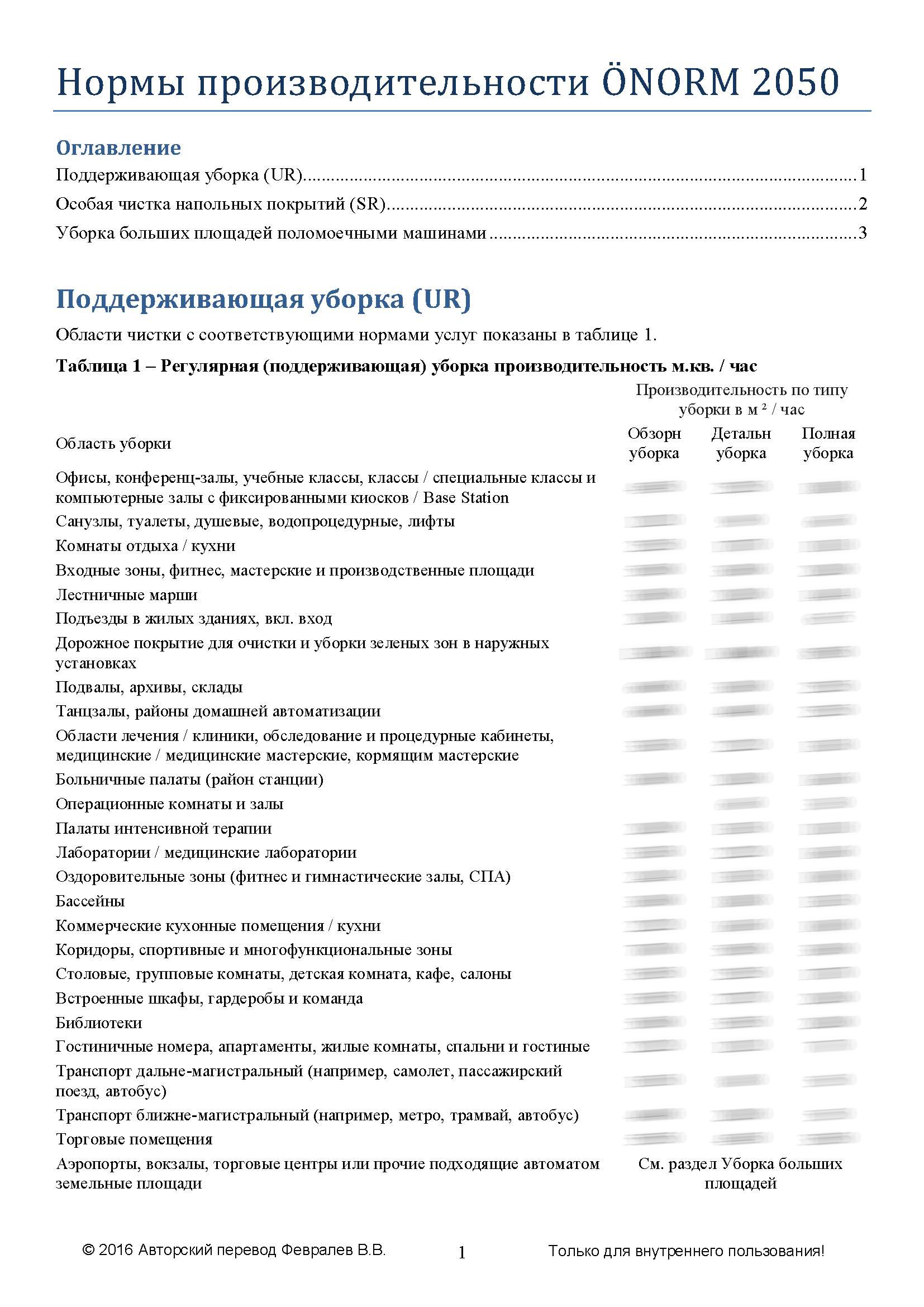 Стандарт ÖNORM D 2250:2014-07Австрийский стандарт производительности клининговых работ. Эти нормы определяют производительность клининговых услуг в зависимости от видов уборки, площадей помещения и использования помещения. В скачиваемом файле таблица с нормативными данными. (4 страницы) Русскоязычная версия. |