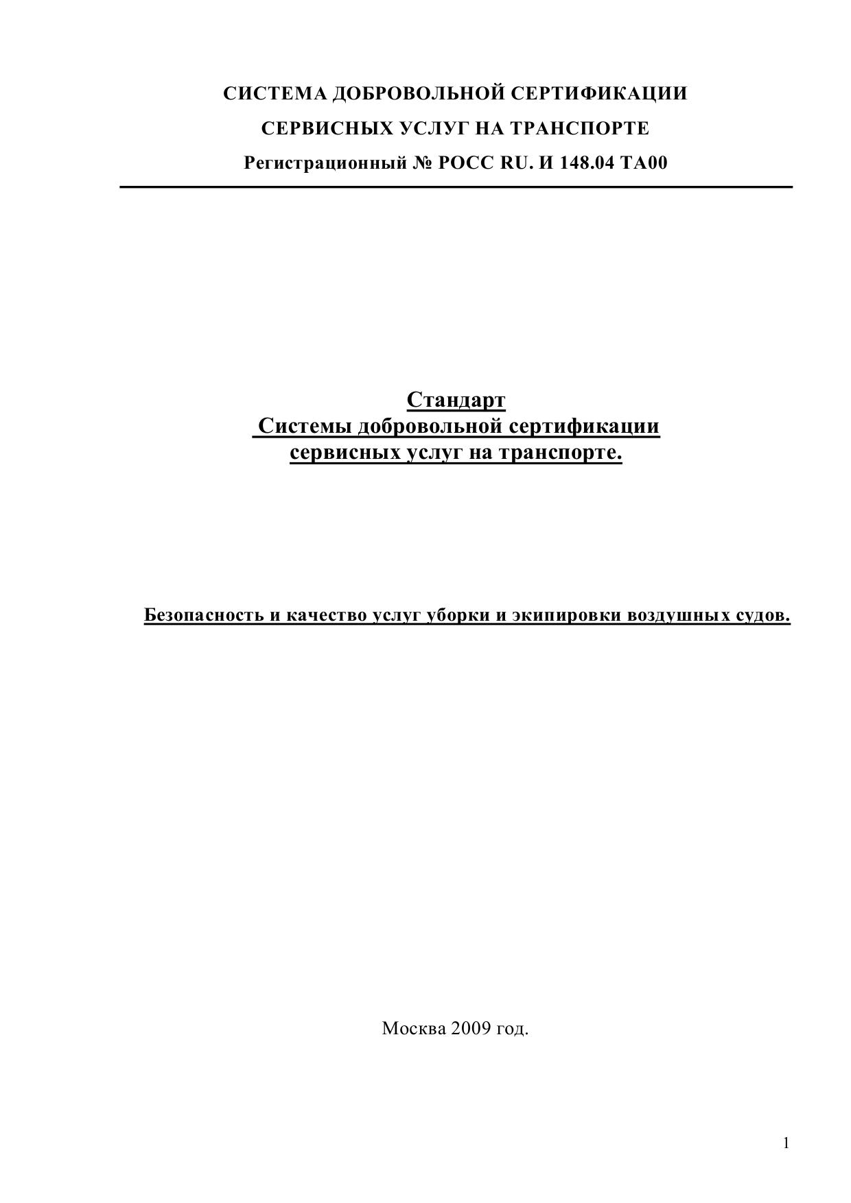 Стандарт системы добровольной сертификации сервисных услуг на транспорте. «Безопасность и качества услуг уборки и экипировки воздушных судов».