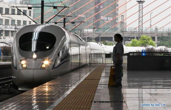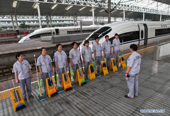 The team leader Feng Dandan gives instructions to team members before the arrival of a Chinese Railway High Speed(CRH) train in east China's Shanghai, June 28, 2012. As the peak summer transportation approaches, cleaning staff at the train station are required to finish the cleaning within five minutes in order to insure that the train departs on schedule. (Xinhua/Niu Yixin)