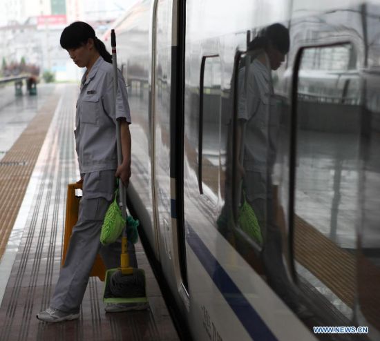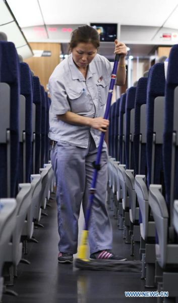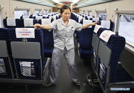 Gong Aimei, a cleaning staff walks out of a compartment of a Chinese Railway High Speed(CRH) train in east China's Shanghai, June 28, 2012. As the peak summer transportation approaches, cleaning staff at the train station are required to finish the cleaning within five minutes in order to insure that the train departs on schedule. (Xinhua/Niu Yixin)
