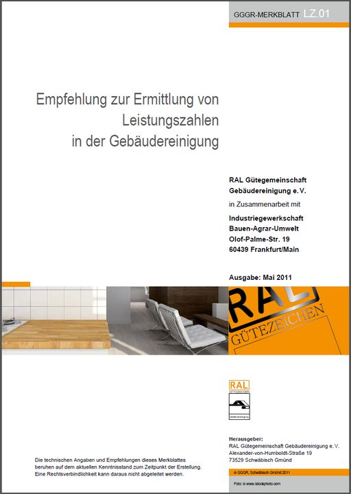 Die RAL Gütegemeinschaft Gebäudereinigung e.V. hat in Zusammenarbeit mit der Industriegewerkschaft Bauen-Agrar-Umwelt im Mai 2011 das Merkblatt “Empfehlung zur Ermittlung von Leistungszahlen in der Gebäudereinigung” herausgegeben. Die Leistungszahlen sind Richtwerte und haben keinen verbindlichen Anspruchscharakter.