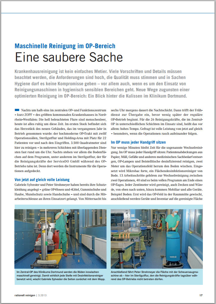 Krankenhausreinigung ist kein einfaches Metier. Viele Vorschriften und Details müssen beachtet werden, die Anforderungen sind hoch, die Qualität muss stimmen und in Sachen Hygiene darf es keine Kompromisse geben – vor allem auch, wenn es um den Einsatz von Reinigungsmaschinen in hygienisch sensiblen Bereichen geht. Neue Wege zugunsten einer optimierten Reinigung im OP-Bereich: Ein Blick hinter die Kulissen im Klinikum Dortmund.