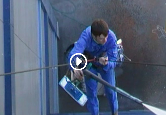 Видеообзор мойки фасада облицованного аюминиевого композита с помощью аппарата высокого давления альпинистом.