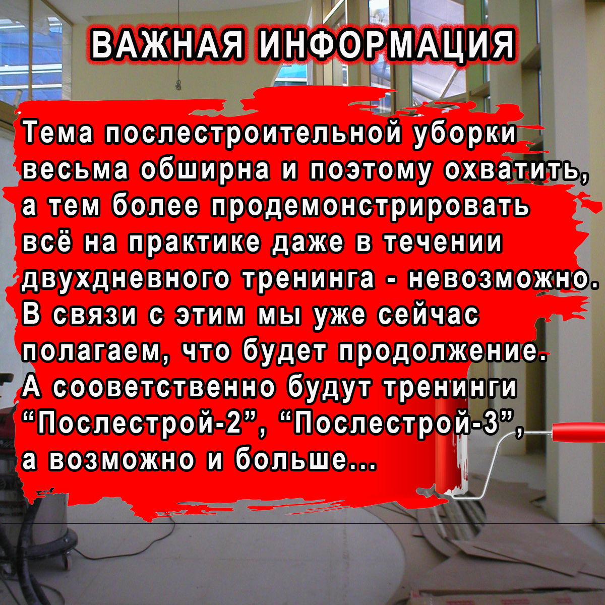 Исходя из пожеланий, вопросов и комментариев к анонсу семинара-тренинга на тему послестроительной уборки и чистки, а также с учетом продолжающейся пандемии, было принято решение изменить его формат.